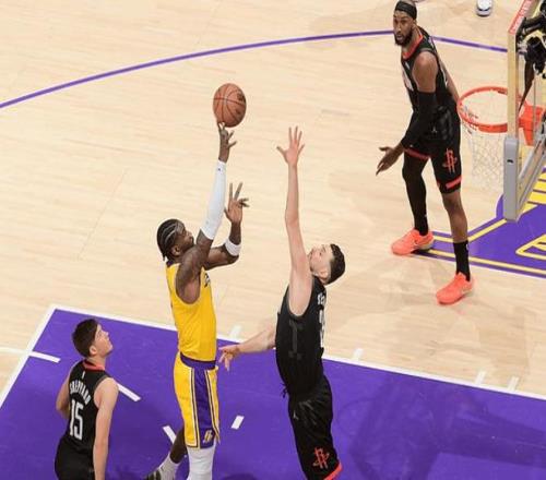 半场比赛战罢,湖人50-48领先火箭2分。下半场比赛开始,易边再战,谢泼德后撤步三分球突施冷箭,揭开第三节比赛序幕,艾顿在篮下连续的拼抢到进攻篮板,飞身补篮得手,詹姆斯背身坐打,面对年轻人毫不留情,翻身跳投砍下两分,小史密斯的侧翼三分火速跳投一击命中,八村塁不甘示弱,45度角追身三分立马回应一球,肯纳德的底角三分空位出手同样也有,拉拉维亚长驱直入刚猛上篮制造杀伤,站上罚球线两罚全中,湖人通过连续的冲击篮下制造杀伤,开始占据主动权,取得10分左右领先优势,三节比赛打完,湖人75-66领先火箭队9分。
