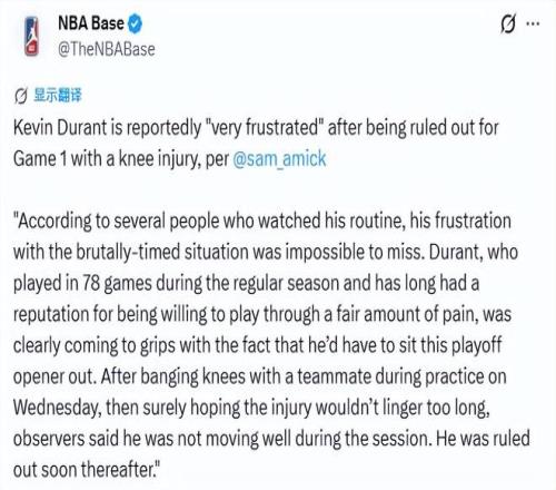 北京时间4月19日,缺少杜兰特的火箭输掉了G1,而据名记Amick报道,杜兰特本人对不能出战首场季后赛感到非常沮丧。